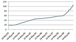 As can be seen in the graph to the right, the retailer had seen rapid growth since the end of 2008, doubling the number of their stores from 61 in November 2008 to 123 in December 2009.[25] Company owner Lalani said that finding sites was getting easier because of the new empty rate tax on commercial property. Whereas, previously, landlords would decline to have a discount shop filling their empty stores, they were less reluctant to fill them with discount stores, as they were being charged for stores which lie empty.[21] Stuart Donnelly, head of property at 99p Stores, noted that landlords were being much more proactive, inviting potential retailers to come and have a look at their locations with the hope of them taking up a lease, as the property market has been badly affected by the recession, allowing the company to drive competitive deals to further expand their portfolio of stores with less expenditure, something that wouldn't have been possible just a few years previously.[26] Landlords were regarding 99p Stores as an anchor tenant due to the significant number of customers one of their stores can bring to a location.[6]