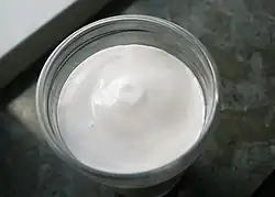 Filmjölk (Swedish: [ˈfîːl.ˌmjœlk]), also known as fil, is a traditional fermented milk product from Sweden, and a common dairy product within most of the Nordic countries. It is made by fermenting cow's milk with a variety of bacteria from the species Lactococcus lactis and Leuconostoc mesenteroides.[1][2] The bacteria metabolize lactose, the sugar naturally found in milk, into lactic acid, which means people who are lactose intolerant can tolerate it better than other dairy products. The acid gives filmjölk a sour taste and causes proteins in the milk, mainly casein, to coagulate, thus thickening the final product. The bacteria also produce a limited amount of diacetyl, a compound with a buttery flavor, which gives filmjölk its characteristic taste.[3]
