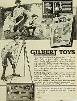 First known as the Mysto Manufacturing Company, the company was founded in 1909 in Westville, Connecticut, by Alfred Carlton Gilbert, a magician, and his friend John Petrie, to provide supplies for magic shows.[2][3] Their "Mysto Magic" magician's sets were marketed from the 1910s until the 1950s. The sets contained a variety of objects including interlocking rings, playing cards, and a magic wand.[4]