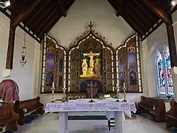 - Reredos, Our Lady and St Benedict's Catholic Church, Wootton Wawen, Warks (1888). Skipworth designed a triptych reredos with alabaster figures, depicting the crucifixion and the annunciation, for St Leonard's, Newark, Notts, in 1888. In 1978 the church was closed and demolished, and the fittings were sold.[14] It was acquired by and installed in Our Lady and St Benedict's Catholic Church, Wootton Wawen.[15]