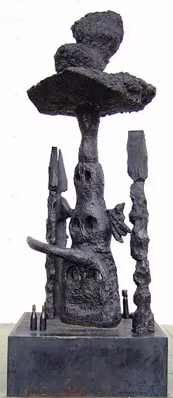 Penck's sculptures, although less known, evoke the same primitive themes as his paintings and drawings and use common materials, such as wood, bottles, cardboard boxes, cans, packing tape, tin and aluminum foil, wire and paste, all done with simplicity and spontaneity.[11]