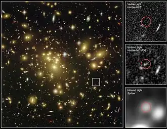![]() Location of A1689-zD1 in infrared and visible light by Hubble Space Telescope and Spitzer Space Telescope | |