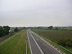 It resumes the route of the Great North Road. At the point where it runs parallel to runway of the former RAF Dishforth at Norton-le-Clay, it joins the route of the Roman road Dere Street. The road becomes the parish boundary between Marton-le-Moor and Dishforth. At Dishforth, the road leaves Dere Street and forms part of junction 49 of the A1(M). The A1 junction was planned in the 1970s to be the northern terminus of the A6183, a motorway-standard road that bypassed Leeds to the west from Kirkhamgate, north-west of Wakefield. The scheme was eventually condensed into the A1-M1 motorway link road and the improvement of the A1 to Dishforth. The A168 becomes the main route from the A1 to Teesside, joining the short section of the A168(M), and a trunk road. The former route went through Dishforth, to the south. The South of Topcliffe and Asenby By-pass, including Dishforth by-pass section was built in 1970, connecting with the A1 at the Dishforth Roundabout. At Asenby, the A167 leaves to the left, which is the former route of the A168, and the A168 bypasses Asenby and Topcliffe, crossing the River Swale. The Topcliffe and Asenby By-pass was built in the 1970s, opening in September 1977.[4] There is a left turn for Topcliffe, the A167, also for RAF Topcliffe (which is still operational), and access to the east for Dalton and the former RAF Dalton. RAF Dishforth, Dalton, and Topcliffe were all used by No. 6 Group RCAF during the Second World War. It rejoins the former route. The South of Thirsk By-pass to north of Topcliffe and Asenby By-pass section opened in the late 1960s. In the parish of Topcliffe, there is a left turn for Sowerby, the B1448, the former route of the A168. The road becomes part of the Thirsk bypass, and at Sowerby crosses the East Coast Main Line, then Cod Beck. At Pudding Pie Hill it meets the A170 at a grade-separated junction, where the road continues as the A19 to Teesside. The improvements from the A1 to Thirsk in the late 1960s originally included classifying that section as the A19, not the A168. The Thirsk by-pass opened as the A19 in September 1972.