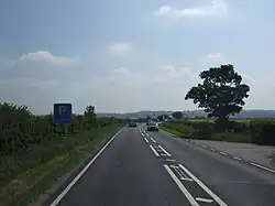The A17 meets the north–south A15 at the Holdingham Roundabout. Sleaford was bypassed by the A17 on 27 March 1975, when opened by Joseph Godber. The section from the A15 to the A153 had earlier been opened on 14 November 1973. It is the only substantial section of dual-carriageway on the route, and the main opportunity to overtake caravans and lorries.[4] There is the grade-separated Bone Mill Junction with the A153, which shares the route from Holdingham, and the B1517 for Sleaford. It crosses the Peterborough to Lincoln Line, then the River Slea and the Spires and Steeples Trail.[5] East of here to the road's eastern terminus, the landscape is flat. At Kirkby la Thorpe it meets the former route from Sleaford, near the Queens Head. The former route has a 13 ft 9in low (railway) Boston Road Bridge, another important reason for building the bypass. From here to Swineshead, the road follows the railway from Sleaford to Boston. There is a left turn for Asgarby, and a right turn for Burton Pedwardine.
