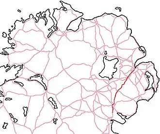 The A1 is a major route in Northern Ireland. It runs from Belfast via Lisburn and Banbridge to the border with the Republic of Ireland south of Newry, from where the road continues to Dublin, becoming the N1 road and M1 motorway. Between Sprucefield and Carrickcarnan the road forms part of the European route E01.