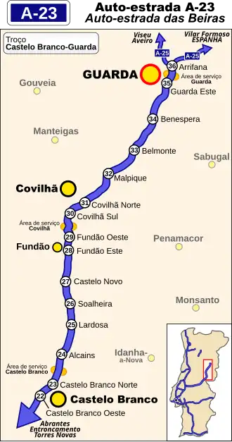 The A23 (Portuguese: Auto-Estrada da Beira Interior) is a motorway (freeway) in Portugal. It connects Guarda, at the A25 motorway (near the Spanish border), to Torres Novas at the A1, the main motorway of Portugal.