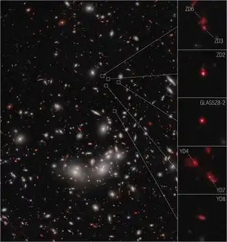 - ^ a b Morishita, Takahiro; Roberts-Borsani, Guido; Treu, Tommaso; Brammer, Gabriel; Mason, Charlotte A.; Trenti, Michele; Vulcani, Benedetta; Wang, Xin; Acebron, Ana; Bahé, Yannick; Bergamini, Pietro; Boyett, Kristan; Bradac, Marusa; Calabrò, Antonello; Castellano, Marco (April 2023). "Early Results from GLASS-JWST. XIV. A Spectroscopically Confirmed Protocluster 650 Million Years after the Big Bang". The Astrophysical Journal Letters. 947 (2): L24. arXiv:2211.09097. Bibcode:2023ApJ...947L..24M. doi:10.3847/2041-8213/acb99e. ISSN 2041-8205.