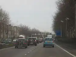 Between interchanges Holendrecht and Oudenrijn, the road has been widened from six (2x3) to ten (2x5) lanes. It has enough space to expand the road to fourteen (2x7) lanes. Near the city of Utrecht, a system of local-express lanes has been applied, with the inner three lanes serving express traffic, and the outer two lanes serving local traffic. Unlike the situation near Eindhoven, the motorway status is maintained for local lanes, which means that all ten lanes will keep the name A2.[4][5]