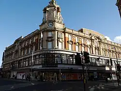 The western end of the street has the highest footfall, due to large commuter flows towards Clapham Junction station. Its architecture is dominated by the landmark Arding & Hobbs building (the greater part of which is still a department store, now Debenhams), a number of restaurants and cafes (including a branch of Pizza Express with decoration loosely themed on The Lavender Hill Mob). There is a large Asda supermarket with an underground car park, and a branch of Whole Foods Market. This section also includes the Battersea central Post Office and telephone exchange, and the Grade II listed Battersea Reference Library.[29]