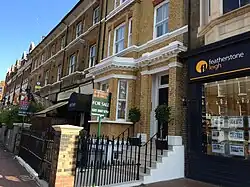 The eastern end of the street is anchored by smaller branches of Sainsbury's and Tesco at the crossroads with Queenstown Road. It includes a wide variety of restaurants and bars, helped by wide pavements that provide outdoor seating. There are also clusters of shops from sectors including cycling, music equipment, interior design, decorators merchants, and contemporary furniture. This section of the road is dominated by independent businesses with relatively few national operators (with the exception of a few cafes such as Caffè Nero).