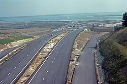 multi-carriageway road with vehicles passing under an elevated roadway and distant view of sea beyond