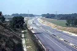 Lord Montagu of Beaulieu stressed the urgency of building a Kingston bypass in 1911, but public funds were not secured before the onset of World War I and were not available in the aftermath.[2] By the early 1920s, traffic in Kingston town centre had increased by over 160% in 10 years in the coaching town and the decision was taken in 1923 to revive the plans, with the contract worth £503,000 (equivalent to £36,200,000 in 2023).[3] Work started in 1924, and it was opened by the Prime Minister, Stanley Baldwin, on 28 October 1927. It ran for 8.5 miles (13.7 km) from the Robin Hood Gate of Richmond Park to the outskirts of Esher. The opening ceremony concluded with refreshments for 800 guests in marquees near to the northern start/end. Its construction immediately attracted developments of housing where access was easiest. The Restriction of Ribbon Development Act 1935 came too late to prevent this private housing, which is apparent where the A3 winds through Tolworth and New Malden, where the architecture includes concrete to art nouveau apartments[n 1], Mock-Tudor gabled houses and gabled Arts and Crafts movement-inspired houses. The final section of the Kingston bypass now forms part of the A309 thanks to the construction of the Esher bypass.