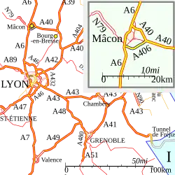 The A406 autoroute is a 11.1 km (6.9 mi) long motorway skirting the south side of Mâcon, France. It was opened in 2011. It connects the RN 79, and also the A6 motorway with the A40 motorway (connection Mâcon - Geneva, Switzerland via Bourg-en-Bresse).[1]