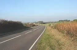 A section of road follows with several sharp bends, after which it passes through the villages of Hermon and Llangadwaladr, crosses some dunes and the Afon Ffraw to enter Aberffraw. About three miles later, the sea becomes visible to the left. Leaving the coast soon afterwards, the road splits; one section goes straight ahead and under the railway, while the other loops back to the left, with a small lake on the right, and enters the seaside village of Rhosneigr. It curves round to the right, passes under the railway and rejoins the other branch at Llanfaelog, having covered a distance of 2.5 miles (4.0 km) as against the other branch's 0.5 miles (0.8 km). Now travelling northeastwards, the road continues for about 3 miles (5 km) to join the A55 at a dumbbell interchange, terminating a few hundred yards later at the A5 between Bryngwran and Gwalchmai, the road continuing northeastward as the B5112.[1][2]