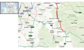 The A624 road is a main road in the English county of Derbyshire. It connects Glossop to Chapel-en-le-Frith passing through Chunal, Hayfield, and New Smithy.
