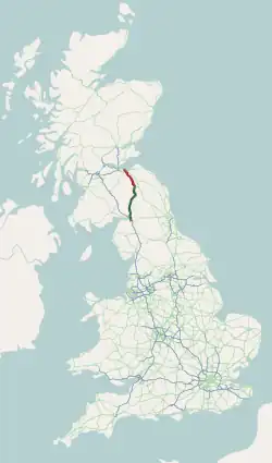 | Cumbria | Carlisle | 0.0 | 0.0 | Botchergate (A6 south) | Southern terminus; northern terminus of A6 | |||