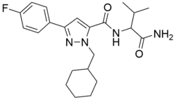AB-CHFUPYCA (also AB-CHMFUPPYCA)[1] is a compound that was first identified as a component of synthetic cannabis products in Japan in 2015.[2][3] The name "AB-CHFUPYCA" is an acronym of its systematic name N-(1-Amino-3-methyl-1-oxoButan-2-yl)-1-(CycloHexylmethyl)-3-(4-FlUorophenyl)-1H-PYrazole-5-CarboxAmide. There are two known regioisomers of AB-CHFUPYCA: 3,5-AB-CHMFUPPYCA (pictured) and 5,3-AB-CHMFUPPYCA.[4] The article[1] refers to both 3,5-AB-CHMFUPPYCA and 5,3-AB-CHMFUPPYCA as AB-CHMFUPPYCA isomers, so AB-CHMFUPPYCA and AB-CHFUPYCA are not names for a unique chemical structure.