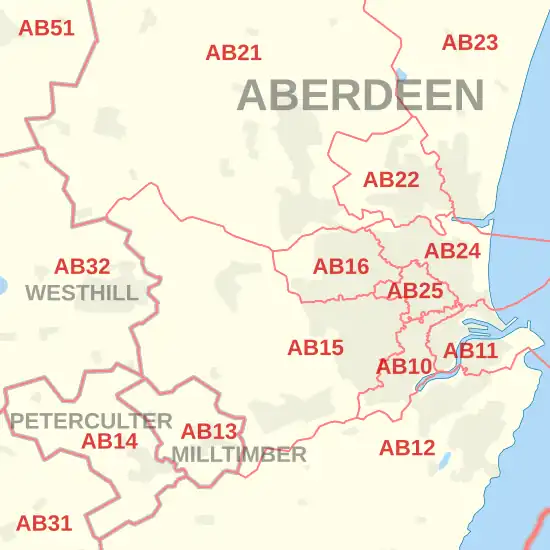 The AB postcode area, also known as the Aberdeen postcode area [2] is a group of 33 postcode districts in north-east Scotland, within 24 post towns. These cover the Aberdeen council area (including the city of Aberdeen, Milltimber and Peterculter), Aberdeenshire (including Banff, Macduff, Fraserburgh, Peterhead, Ellon, Turriff, Huntly, Insch, Inverurie, Westhill, Alford, Strathdon, Ballater, Aboyne, Banchory, Laurencekirk and Stonehaven) and east Moray (including Buckie, Keith, Aberlour and Ballindalloch).