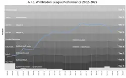 In November 2020, the club moved to Plough Lane, a new stadium, only 250 yards away from the original Plough Lane, Wimbledon's home until 1991. The club played its first match at the new stadium on the evening of 3 November 2020; a 2–2 draw against Doncaster Rovers.[65] The club's youth coach, Mark Robinson, replaced Hodges on 30 January 2021, after a run of poor results;[66] Robinson turned the season around and the club avoided relegation on the second-last matchday.[67] At the end of the 2021–22 season, Wimbledon were unable to avoid relegation from League One, finishing in 23rd position.[68] Following relegation, Johnnie Jackson was appointed as the new manager.[69] They earned promotion back to League One at the end of the 2024–25 season, defeating Walsall 1–0 in the play-off final.[70]