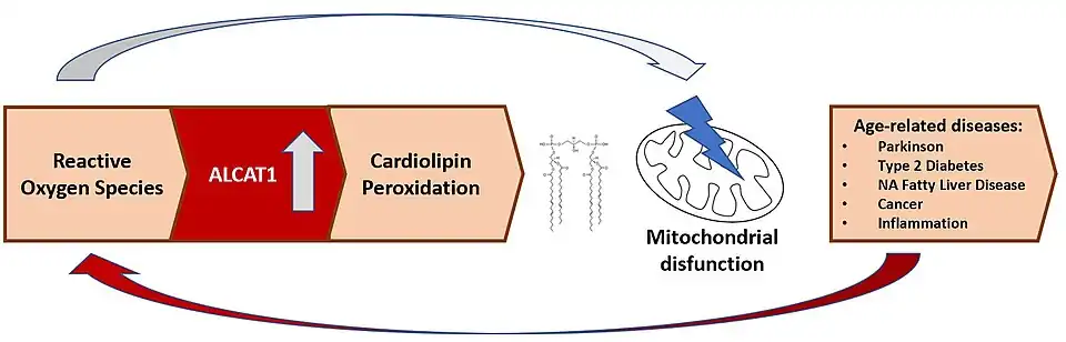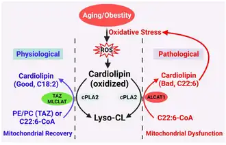 While competing against MLCLAT and Tafazzin (TAZ) in re-acylation of MLCL back to cardiolipin, ALCAT1 has much worse selectivity in linoleic acyl.[7] ALCAT1 occasionally remodels cardiolipins with very-long-chain fatty acyls, such as docosahexaenoic (DHA) and arachidonic, leading to cardiolipins with not only non-optimal functionality compared to that of tetralinoleoyl cardiolipin (TLCL), but also vulnerability to oxidation. Subsequent mitochondrial dysfunction leads to more oxidative stress and reactive oxygen species (ROS), and consequently faster depletion of physiological cardiolipin due to oxidation. Moreover, the activity of ALCAT1 is up-regulated by oxidative stress, which closes the loop of a vicious cycle that is implicated in the pathogenesis of various age-related diseases.[6][8]