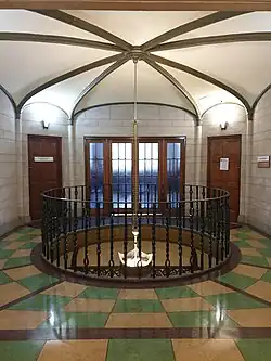 The faience terracotta panelling of the exterior by Wunderlich was matched in the principal public interior spaces and the six full-size medieval knights in armour along with two koalas perched high on the facade were manufactured by the same firm. The spectacular assembly hall was panelled with Queensland maple and with Colotex, which was affixed to battens on the concrete walls to give the best acoustics and insulation. Dr Todd died just a year after the building was completed and the hall became the Robert H. Todd Assembly Hall.[1]
