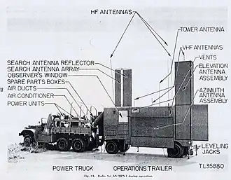 - AN/MPN-1 was used to assist the process of directing aircraft over a predetermined glide path for safe approach to an aerodrome runway under conditions approaching zero visibility. A V-8 truck contains the system's two PE-127 power units (rated output of each 7.5 kW), one air conditioner unit, and equipment spare parts. An additional diesel generator was usually mounted on a bomb trailer and towed behind the radar trailer. The V-2 trailer contains the system's radar and communications sets. The radar provides range and azimuth information on aircraft within a radius of 30 miles (48 km) with an operational ceiling of 4,000 feet (1,200 m). High Frequency (HF) and Very High Frequency (VHF) communications were provided by the SCR-274 transmitter, and BC-342 receivers. Ultra High Frequency (UHF) communications were added later via tactical radios normally jeep mounted for use by forward air controllers.