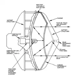 The two X-band feed horns are mounted back-to-back near the focus of the parabolic surface. The X-band feed horn facing the main dish radiates vertically polarized RF energy. The subdish is transparent to this radiation, and the main dish reflects it as a narrow beam for CW illumination. The X-band feed horn facing away from the main dish transmits X-band, vertically polarized RF energy as a broad beam centered about the main CW illuminating beam. This provides the rear reference beam, which provides the missile with identification of the proper illumination radar.[5][6]