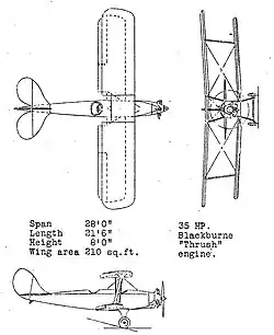 - Powerplant: 1 × Blackburne Thrush 3-cylinder air-cooled radial piston engine, 35 hp (26 kW)