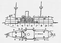 Almirante Brown was equipped with a main battery of eight 8-inch (203 mm) BLR Armstrong guns, all mounted individually in casemates. Six were in a central battery, and the other two were in the bow and stern as chase guns. The central battery was sponsoned out over the hull to position the guns such that four could fire directly ahead and two could fire astern.[4] These breech-loading guns were a new development, which rendered Almirante Brown a significantly more powerful vessel than even those that had been completed a few years earlier. The central battery was protected by heavy armor plate, but the chase guns were entirely unprotected, beyond the thin hull plating that enclosed their positions.[10] The guns fired a 180-pound (82 kg) shell, using a 90 lb (41 kg) propellant charge. These shells were capable of penetrating 16 in (410 mm) of wrought iron armor, which was the type of armor that protected most ironclads in service in foreign navies.[11]