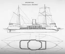 ARA Almirante Brown was a central battery ironclad of the Argentine Navy built in the 1880s by Samuda Brothers in London. Almirante Brown displaced 4,200 long tons (4,300 t) and had a top speed of 14 knots (26 km/h; 16 mph). The ship was protected by a belt of nine-inch (230 mm) steel-faced armor and she carried a main battery of eight breech-loading guns. She was among the first major warships in the world to use steel armor, and remained the largest vessel in the Argentine fleet for over 15 years. Almirante Brown had a peaceful career in the fleet during the 1880s and 1890s. By the 1920s, she was reduced to a coastal defense ship, and remained in service until the early 1930s. She was stricken from the naval register in November 1932 and sold for scrapping.