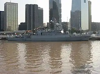 The Argentine Navy struggles to meet maintenance and training requirements because of financial problems and import restrictions. The status of Parker was not clear, as of November 2012 she was waiting for spares.[4] As of 2021, Parker was scheduled for repair work, and conversion to the offshore patrol role, at the Tandanor state-owned shipyard in Buenos Aires.[5] The work to convert the ship to her new role had been expected to last through 2023. However, as of late 2024 the status of the conversion was unclear and the ship was effectively inactive.[6]