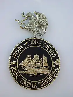 The body of the shield is made up of two concentric circles: the exterior, like a cord of abacá, suggests the ship's rigging, the tool necessary for the crew to raise and lower the sails. The inner circle serves to concentrically divide the total circumference of the body. The internal part of these carries in its center the silhouette of Cuauhtémoc on her port side and with all the rigging, sailing to the west, driven by the wind, represents her first trip to Mexico from Spain. In the ring formed by the two circles there are two inscriptions: reading Armada de México (Mexican Navy) on the top, and Buque Escuela Cuauhtémoc (Cuauhtémoc School Ship), on the bottom.