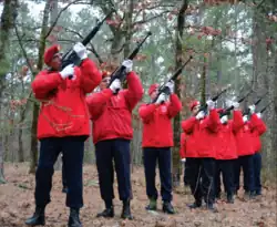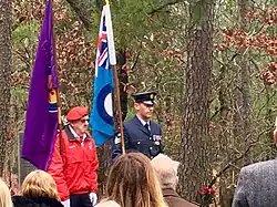 A rededication of the monument took place in 2018, to mark the 75th anniversary of the crashes. Britain's Consul General to the United States, along with a group of Royal Air Force officers and their families, visitors from England, a group from Terrell, Texas and local residents, gathered at the site.[12] The Choctaw Nation assisted with logistics, and its Chief and Assistant Chief hosted the gathering. Its Color Guard presented and retired the colors, this time accompanied by the RAF detachment. School students from Rattan, some of whom are Choctaw Indians, sang “God Save the Queen” and laid roses on the “natural tombstone.”[13]