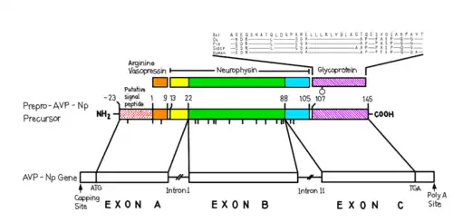 The 1.85 kilobase-long AVP gene, located on chromosome 20 (20p13) contains three functional domains, including AVP, neurophysin II (NP) and a C-terminal glycopeptide called copeptin. Using restriction mapping and sequencing, the gene was found to have these domains which spanned over three exons with two intronic sequences. Exon A encodes a putative signal peptide, the arginine vasopressin hormone, and the N terminus of the NP carrier protein. Exon B, which is separated from exon A with a 1 kilobase-long intron, encodes the conserved middle portion of NP. A 227 kilobase intron separates exon B from exon C, which encodes the final domain, including the C terminus of NP and the glycoprotein. The structure of this gene has been found to be generally conserved across species, including chimpanzees, Rhesus monkeys, dogs, cows, mice, rats, chicken, zebrafish, and frogs.[13]
