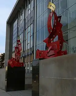A Beam of Sun to Shake the Sky consists of two vertically oriented sculptures set upon massive granite pedestals in front of the library's glass facade. The sculptures appear to be made of bright red ribbon-like strips of painted aluminum that snake skyward.[2] The individual strips each contain cut-out letters in a variety of fonts, languages, and cases. The twin forms are more dense at the bottom, and become lighter toward the top. The highest element on each side is a short, curved strip painted in gold leaf. With their wide bases that taper upward, the forms resemble red candles topped by gold flames. The sculptures are lit from below at night.