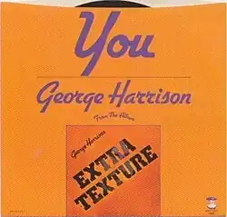 An upbeat pop song in a similar vein to Harrison's 1971 hit "What Is Life",[45] "You" was the most obvious choice for a single off Extra Texture.[14] It was released in advance of the album, backed by "World of Stone", on 12 September 1975 in Britain (as Apple R 6007) and three days later in the United States (as Apple 1884).[69][70] The picture sleeve in Britain featured a photo of a smiling Harrison taken on stage by 1974 tour photographer Henry Grossman; the US picture sleeve incorporated Roy Kohara's humorous design for the album, showing blue lettering on a vivid orange background.[71] In another example of the upbeat mood that was otherwise lacking in the musical content of Extra Texture,[72][73] the single's face labels showed the familiar Apple Records logo as an apple core, a pun on the demise of the company.[74]
