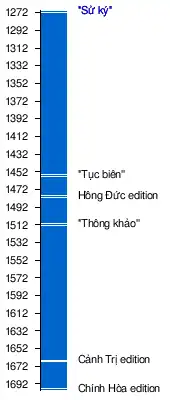 In 1511, the royal historian Vũ Quỳnh reorganized Ngô Sĩ Liên's work in his Việt giám thông khảo by adding the account about Thánh Tông, Hiển Tông, Túc Tông and Uy Mục, which was called Tứ triều bản ký (Records of the Four Reigns).[7][10] Other historians continued to revise Đại Việt sử ký toàn thư and also add the supplemental information about the reign of the Lê dynasty, notably the 23-volume Đại Việt sử ký toàn thư tục biên (Continued Compilation of the Complete Annals of Đại Việt) was published under the supervision of Phạm Công Trứ in 1665 while the "Nội các quan bản" edition, the most comprehensive and popular version of Đại Việt sử ký toàn thư, was printed in 1697 during the Chính Hòa era by efforts of the historian Lê Hi.[7][11][12]
