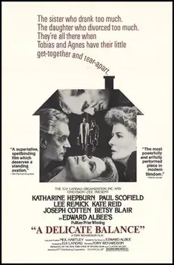 A Delicate Balance is a 1973 American-Canadian-British drama film directed by Tony Richardson and starring Katharine Hepburn, Paul Scofield, Lee Remick, Kate Reid, Joseph Cotten, and Betsy Blair. The screenplay by Edward Albee is based on his 1966 Pulitzer Prize-winning play of the same name.