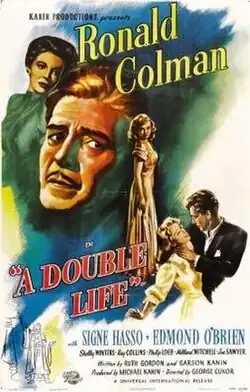 A Double Life is a 1947 American film noir that tells the story of Tony John, an actor whose mind becomes affected by the character whom he portrays. It stars Ronald Colman and Signe Hasso and was directed by George Cukor, with its screenplay written by Ruth Gordon and Garson Kanin.[4] Colman won the Academy Award for Best Actor for his performance.