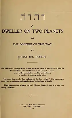 A Dweller on Two Planets, or The Dividing of the Way is a book written by Frederick Spencer Oliver (1866–1899). The book was finished in 1886, typewritten and copyrighted in 1894, and again in 1899 owing to an addition. It was not published until 1905 by his mother Mary Elizabeth Manley-Oliver, six years after Oliver's death.[1]