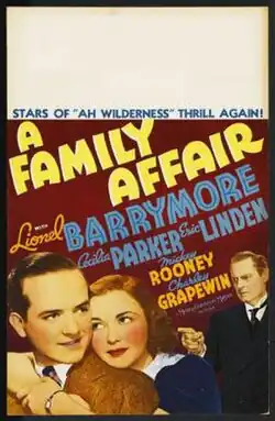A Family Affair is a 1937 American comedy film directed by George B. Seitz and based on the 1928 play Skidding by Aurania Rouverol. It was the first of 16 films now known as the Andy Hardy series, although Andy Hardy did not become the main character in the series until several more installments had been made. The film stars Lionel Barrymore, Cecilia Parker, Eric Linden, Mickey Rooney and Charley Grapewin.[2]