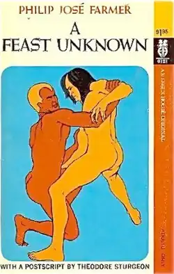 In a postscript to several of the novel's editions, science fiction author Theodore Sturgeon says that the message A Feast Unknown is intended to send to the reader is that "ultimate sex combined with ultimate violence is ultimate absurdity." This is on par with the idea that Farmer intended the novel largely as satire of pulp fiction, deliberately exaggerated to the point of absurdity, as Sturgeon puts it.[2][3] This fact was lost on both the original publisher, Essex House, who produced "quality porn" novels,[4] and many reviewers, including one who condemned A Feast Unknown as "drivel" and "a worthless book".[5]