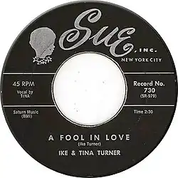 "A Fool in Love" is the debut single by Ike & Tina Turner. It was released on Sue Records in 1960. The song is Tina Turner's first release with the stage name "Tina Turner" although she had been singing with Ike Turner and his Kings of Rhythm since 1956.[3] It was the first national hit record for bandleader Ike Turner since the number-one R&B hit "Rocket 88" in 1951, for which he did not receive proper credit.[4]