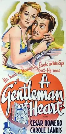 A Gentleman at Heart is a 1942 romantic comedy film starring Cesar Romero, Carole Landis, and Milton Berle. A bookie acquires an interest in an art gallery.