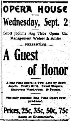 During the tour, either in Springfield, Illinois, or Pittsburg, Kansas, someone associated with the company stole the box office receipts. Joplin could not meet the company's payroll or pay for the company's lodgings at a theatrical boarding house. It is believed the score for A Guest of Honor was confiscated with Joplin's belongings, due to non-payment of his bills.[6] Joplin later traveled to New York in 1907 in order to find financial support and a publisher for the opera, but did not manage to find support.[6] Overall, it is reported that the tour was a financial failure for Joplin, although from 1907 onward, Joplin was again busy working on his second opera, Treemonisha.[2] Scholar Edward Berlin's research noted Joplin's readiness to leave his first opera behind: