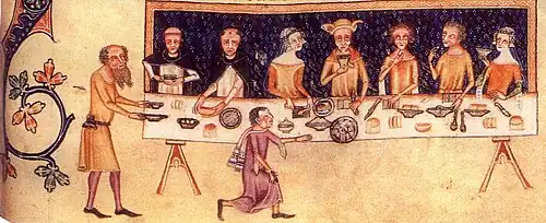 Dickson Wright describes in detail the diet and lifestyle of the Tudor Kings; under the influence of Catherine of Aragon, Henry VIII drank Spanish sherry, imported oranges, and planted salad gardens. Enormous confections were made of marzipan. Commoners too might eat sea and freshwater fish, or beef, though bacon, according to Andrew Boorde in 1542 was "good for carters and plowmen".[8] With the separation of the Church of England from the Church of Rome, religious fasting was reduced, and the fasting rules were relaxed in the time of Elizabeth I, so that eggs, cheese, and milk were allowed even on fast days. Pastry developed from 'coffin' cases meant only to hold the food inside during cooking and serving; now pies and pasties of all kinds were available to travellers. Milk and cream were used in desserts such as junkets and syllabubs. A treat might consist of buns made with eggs, raisins, and spices. In 1604, Elinor Fettiplace compiled a Receipt Book; she had married into an ancient aristocratic family – a Fettiplace fought at the Battle of Hastings in 1066; at least 20 people ate at her table every day. She lists several recipes for bitter Seville oranges. Food is strongly seasonal; she pickles buds, vegetables, and fruits in season, and makes a spiced fruit cake for 100 people for a harvest or other feast. My Lord of Devonshire's Pudding is made of sliced white bread, dates, raisins, marrow or butter, cream, eggs, cinnamon, nutmeg, and sugar—a recipe that Dickson Wright specially likes.