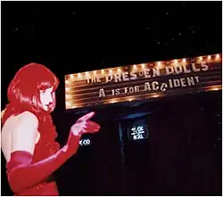 A Is for Accident is the debut live album by American dark cabaret duo The Dresden Dolls, a collection of live and studio recordings from 2001 to 2003, which was released on May 27, 2003, by Important Records. Future pressings were handled by 8 ft. Records and didn't include the bootleg recording of the band covering "Stand by Your Man" by Tammy Wynette. On October 20, 2009, the band released the album at Bandcamp.com, with two unlisted bonus tracks available to those who purchase the entire album (the digital download version, in a variety of formats, is free as of 2012).[2]