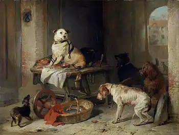 A Jack in Office is an 1833 oil painting by the British artist Edwin Landseer.[1] The title is a reference to a slang term of the era for a pompous, petty official. It depicts the barrow of a salesman of dog meat who has temporary left it in an alleyway guarded by a Jack Russell Terrier who faces down four other dogs who hope by trickery or force to get their hands on the meat..[2]