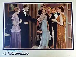 A Lady Surrenders is a 1930 American Pre-Code romantic drama film directed by John M. Stahl and starring Genevieve Tobin, Rose Hobart, Conrad Nagel, and Basil Rathbone. A copy exists in the Library of Congress.[1]