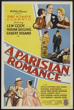 A Parisian Romance is a 1932 American drama film directed by Chester M. Franklin and starring Lew Cody, Marion Shilling and Gilbert Roland.[1] It is based on the play of the same title by Octave Feuillet, which had previously been made into a 1916 silent film.